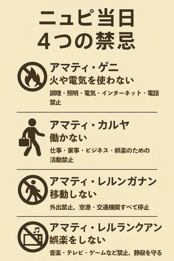 ニュピ当日、バリ島では「チャトゥール・ブラタ・ペニェピアン」と呼ばれる4つの主要な禁忌が厳格に守られます。これらの禁忌は、島にいるすべての人々、地元住民はもちろん、観光客にも適用されます。