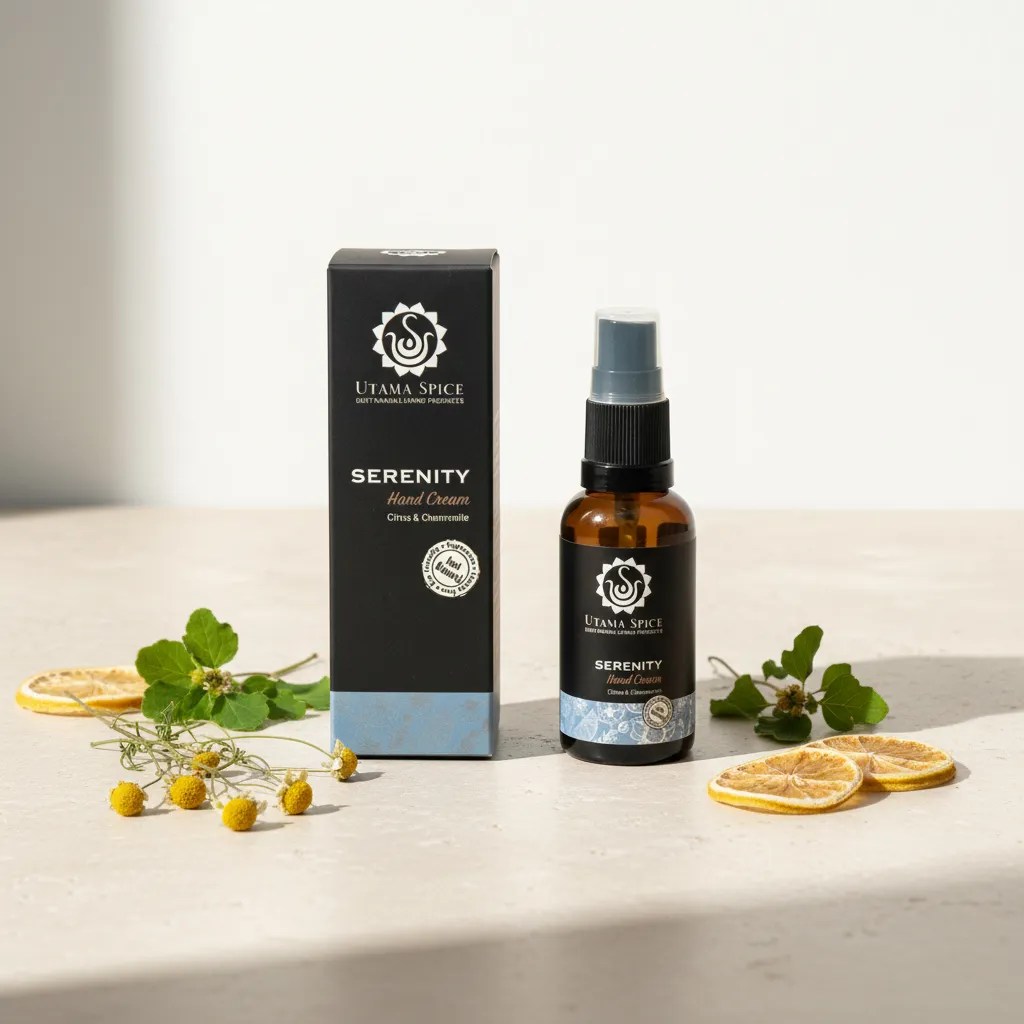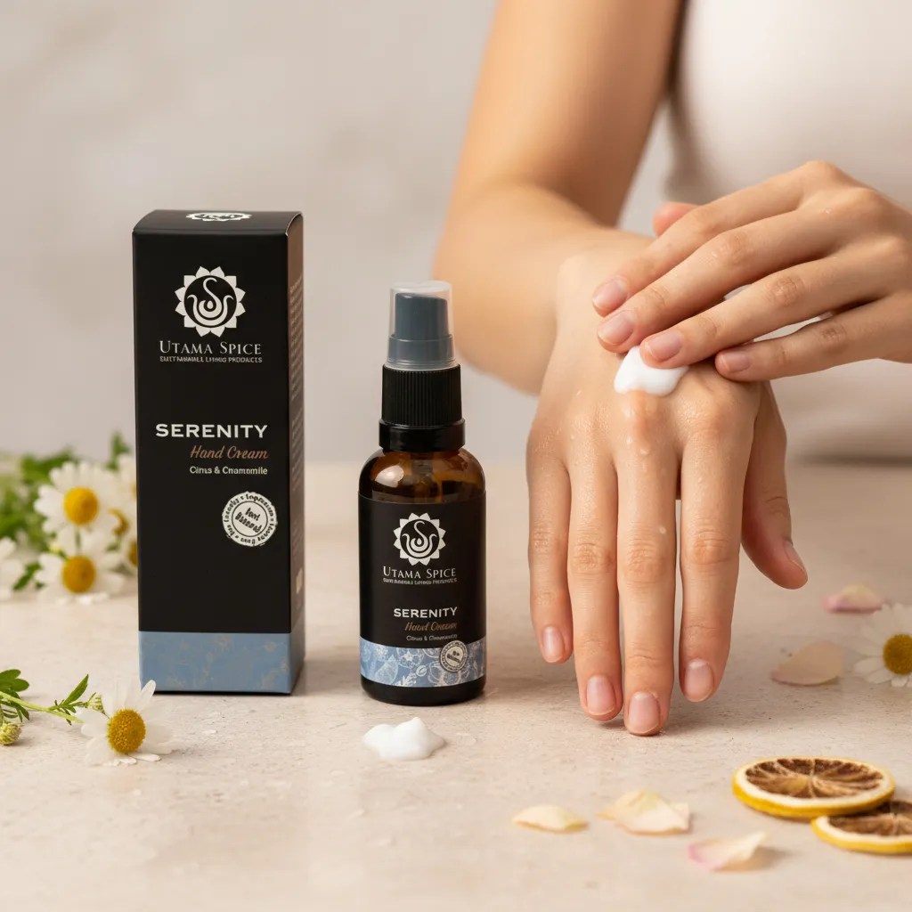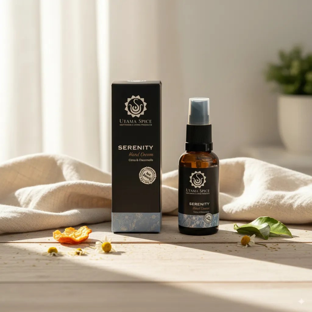 一日の終わりに、頑張った手肌へ。Utama Spiceのセレニティ ハンドクリームが、安らぎのひとときをお届けします。お疲れ気味の乾燥した手肌を、やさしくいたわり、うるおいを与え、すこやかに整えるために作られた、贅沢なナチュラル処方です。厳選された植物オイルと豊かな植物バターを配合した、深いうるおいをもたらすクリームが、手肌をやわらかく、なめらかに。心安らぐエッセンシャルオイルの香りが、あなたを穏やかなリラックスタイムへと誘います。