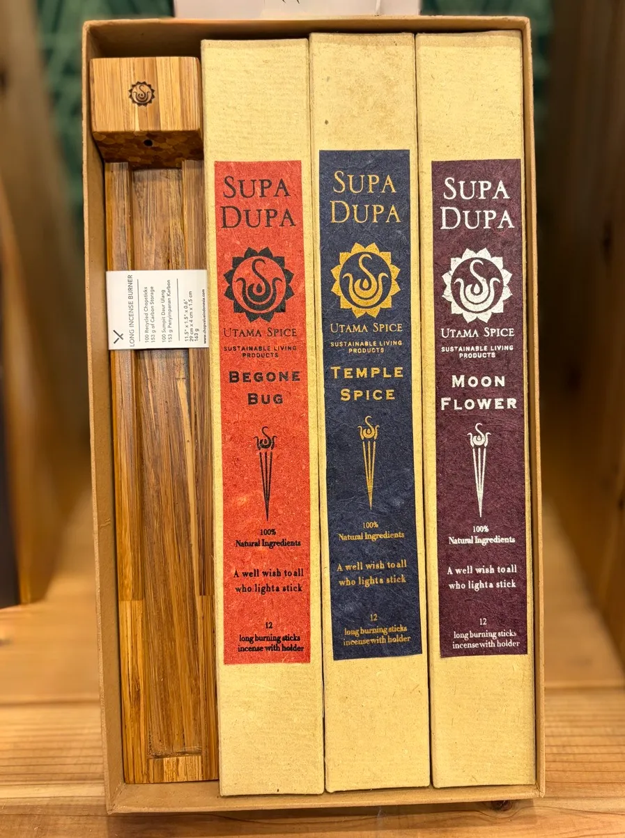 SUPA DUPAのお線香3種類と長いインセンスホルダーがセットになったリチュアル(儀式)のための特別なセット。バリ島は1日に3回のお祈りが毎日捧げられ、「神々の島」とも呼ばれています。その島の豊かな自然を生かして1本ずつ今も変わらず手で作っているお線香。